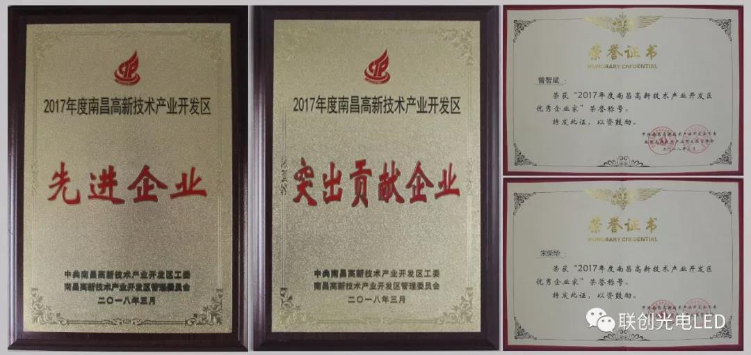 南昌高新區(qū)召開2018年經濟工作暨科技創(chuàng)新大會,聯(lián)創(chuàng)光電被授予“2017年度南昌高新區(qū)先進企業(yè)”、“2017年度南昌高新區(qū)突出貢獻企業(yè)”榮譽稱號,股份公司董事長曾智斌、總裁助理宋榮華分別榮獲“2017年度南昌高新區(qū)優(yōu)秀企業(yè)家”稱號。