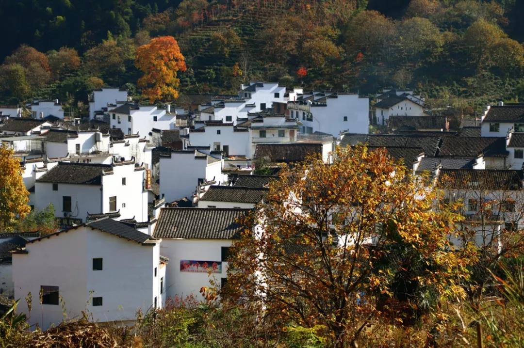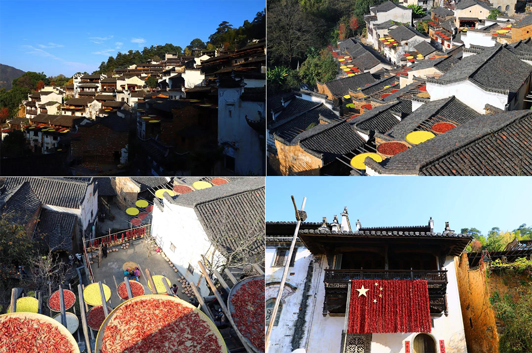 每當(dāng)日出山頭,晨曦初照,整個(gè)山間村落間,那飽經(jīng)滄桑的徽式民宿的土磚外墻與長長木架上,圓圓的竹匾里五彩繽紛的豐收果實(shí)排列組合,繪就出“曬秋”農(nóng)俗景觀,甚是壯觀。